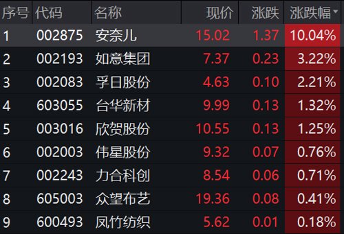 抗病毒面料概念股亦同步上涨,安奈儿大举涨停,如意集团、孚日股份跟涨。