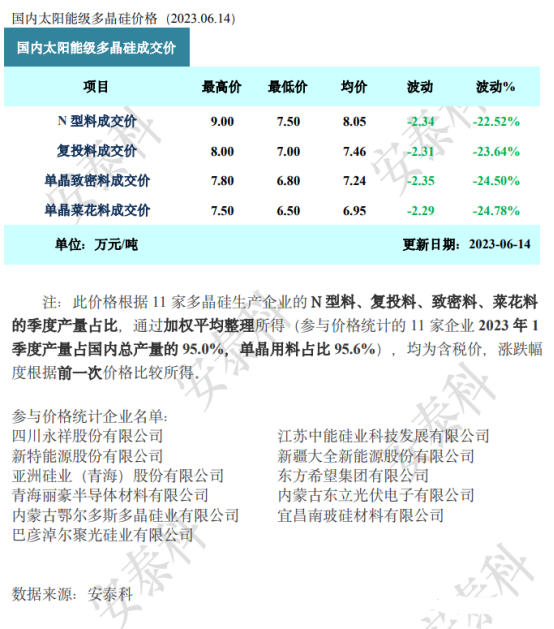 中国有色金属工业协会硅业分会数据显示,本周国内N型料价格区间在7.5-9.0万元/吨,成交均价为8.05万元/吨,周环比降幅为22.52%;单晶致密料价格区间在6.80-7.80万元/吨,成交均价为7.24万元/吨,周环比降幅为24.5%。