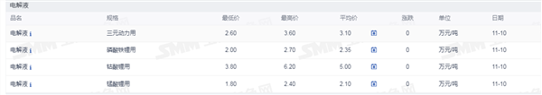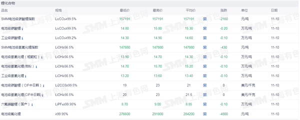网络整理 2025-09-01证券之星新能源车行业周报:据上海有色网,截止11月10日,电池级碳酸锂14.8-15.8万元/吨,均价15.3万元/吨,环比上一工作日下滑0.2万元/吨;工业级碳酸锂14.3-14.9万元/吨,均价14.6万元/吨,环比上一工作日下滑0.1万元/吨。上游锂盐企业更多以长单出售为主,挺价心态依旧,但个别锂盐企业随行就市小幅下调出售价格,下游正极材料企业出于降本增效策略,其散单拿货情绪也依旧低迷,近期碳酸锂现货市场成交价格仍呈现下行趋势。