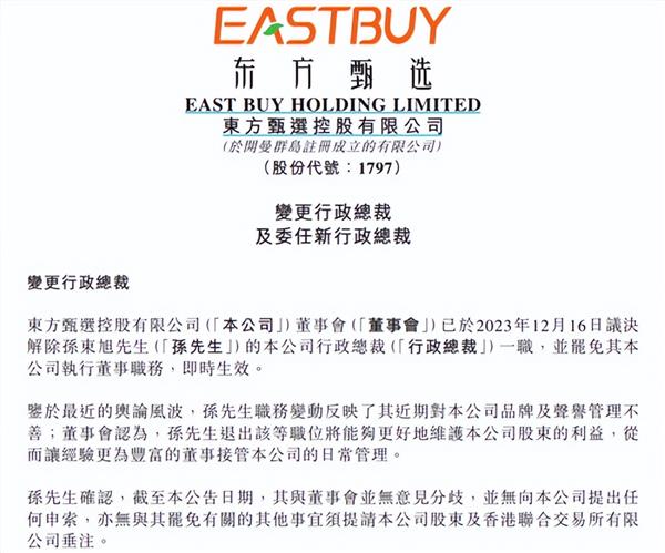 12月17日晚间,东方甄选在港交所公告称,董事会已于12月16日议决解除孙东旭的行政总裁一职,并罢免其公司执行董事职务,即时生效。