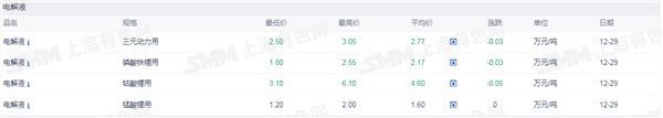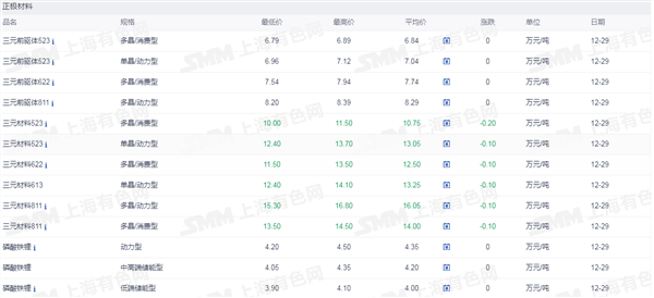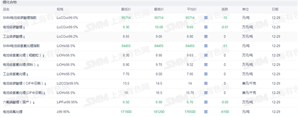 网络整理 2025-09-01证券之星新能源车行业周报:据上海有色网,截止12月29日,电池级碳酸锂9.3-10.08万元/吨,均价9.69万元/吨,环比上一工作日下滑0.01万元/吨;工业级碳酸锂8.55-9.05万元/吨,均价8.80万元/吨,环比上一工作日持平。临近年末,市场成交依旧维持清淡局面。当前贸易商因近期期现货价差扩大,进行持续期现货套利,对锂盐端采买需求小幅增加,而部分盐厂在期货价格相对较高的情况下,交仓意愿亦有所增强,供应端挺价情绪渐浓,市场维持弱稳局面。
