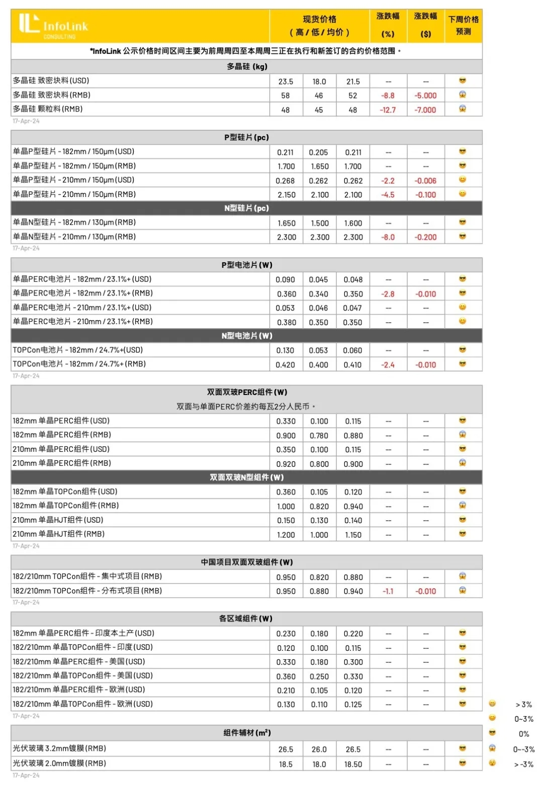 本周硅片端接续跌势,除了P型M10规格外均出现下行,P型硅片中M10,G12尺寸成交价格来到每片1.7与2.1元人民币。N型价格M10,G12尺寸成交价格来到每片1.55-1.6与2.3元人民币左右,各规格跌幅达到3-8%不等。针对N型G12R(182*210mm)的部分,近期厂家也陆续批量采购,当前价格落在每片2.1元人民币不等,预期随着成交家数稳定后,五月有望新增此规格价格公示。
