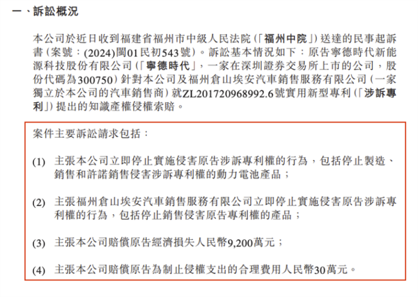7月26日晚间,中创新航发布公告称,公司已收到福建省福州市中级人民法院送达的民事起诉书。起诉书中,宁德时代作为原告,指控中创新航及福州仓山埃安汽车销售服务有限公司(一家与中创新航独立的汽车销售商)侵犯了其ZL201720968992.6号实用新型专利(以下简称“涉诉专利”),并请求法院判决中创新航赔偿经济损失高达9200万元人民币。