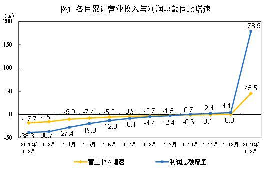 2021年1—2月份,规模以上工业企业实现利润总额11140.1亿元,同比增长1.79倍,比2019年1—2月份增长72.1%,两年平均增长31.2%。