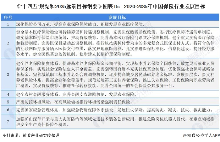 “八五”计划(1991-1995年)至“九五”计划(1996-2000年)时期,国家层面提倡:大力发展保险业,改革保险制度;从“十五”规划开始,规划主要重点在健全社会保险制度和社会保险体系;“十二五”至“十四五”期间,规划明确了要加快完善社会保险制度,明确了深化保险公司改革。到“十四五”时期,根据《“十四五”规划和2035年远景目标刚要》,改革社会保险制度健全全民医保制度成为“十四五”时期的重要任务。