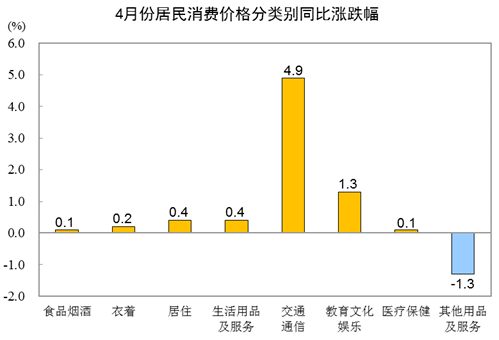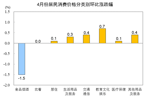 4月份,全国居民消费价格环比下降0.3%。其中,城市下降0.2%,农村下降0.5%;食品价格下降2.4%,非食品价格上涨0.2%;消费品价格下降0.7%,服务价格上涨0.4%。