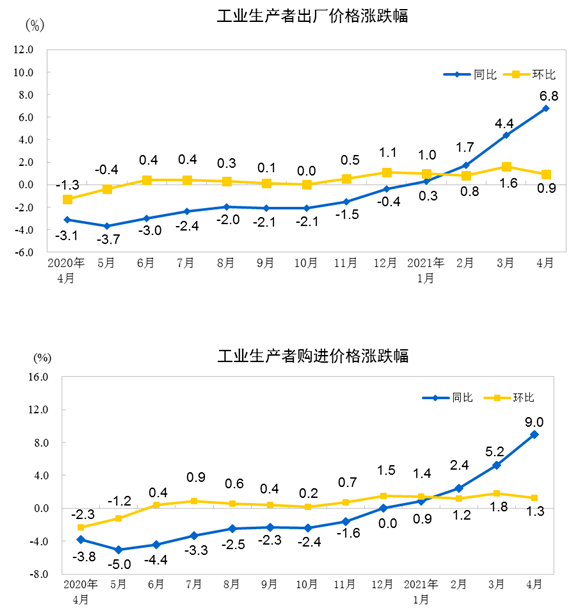 2021年4月份,全国工业生产者出厂价格同比上涨6.8%,环比上涨0.9%;工业生产者购进价格同比上涨9.0%,环比上涨1.3%。1—4月平均,工业生产者出厂价格比去年同期上涨3.3%,工业生产者购进价格上涨4.3%。