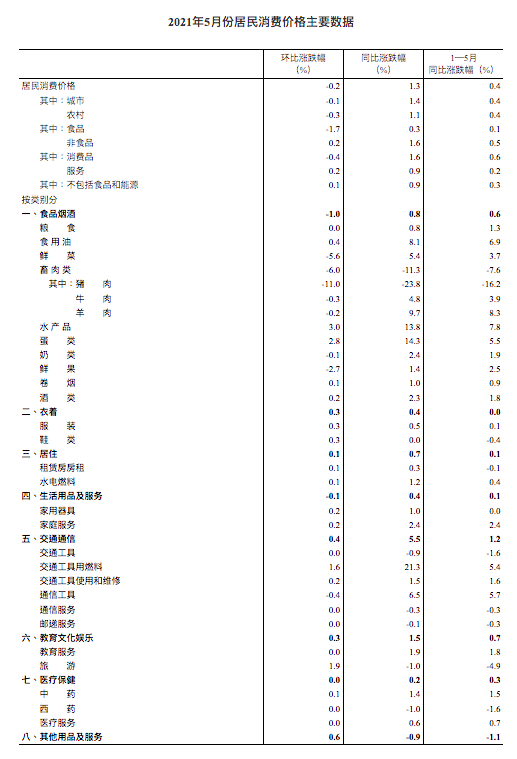 2021年5月份,全国居民消费价格同比上涨1.3%。其中,城市上涨1.4%,农村上涨1.1%;食品价格上涨0.3%,非食品价格上涨1.6%;消费品价格上涨1.6%,服务价格上涨0.9%。1—5月平均,全国居民消费价格比去年同期上涨0.4%。