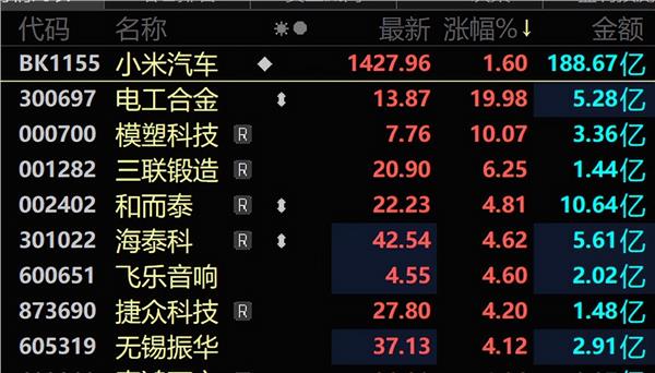 小米汽车概念股集体高开,电工合金、模塑科技涨停。无锡振华、凯众股份也以涨停价开盘,海泰科、富特科技大幅高开。不过,截至发稿,部分股票涨幅有所收窄。