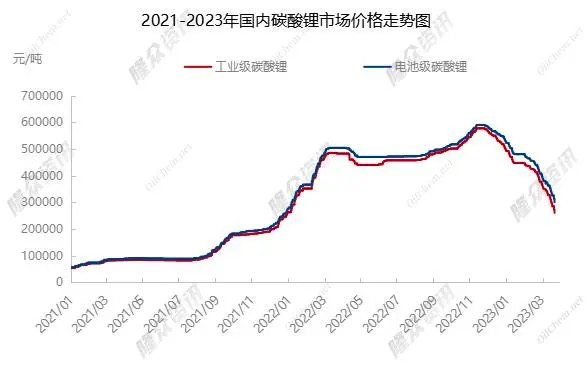 其实,进入2023年以来,碳酸锂价格持续“跌跌不休”。2022年11月,碳酸锂价格一度冲高至近60万元/吨后,短短4个月,电池级碳酸锂价格的累计跌幅已接近50%。
