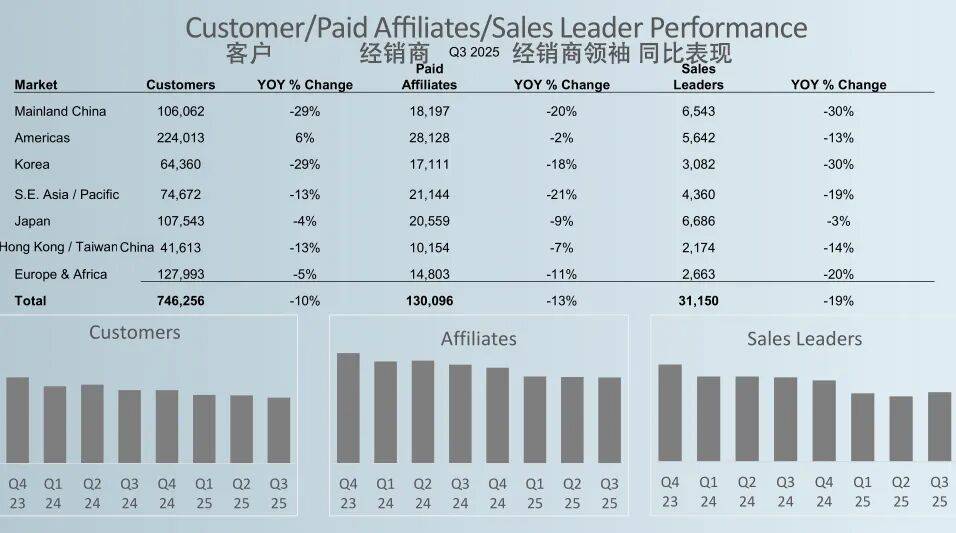 网络整理 2025-11-16三季度,虽然各市场区域净销售额全线下滑,但如新的经销商领袖数量环比有所增长;中国区业绩4250万美元(约合3亿元人民币),同比下滑20%,中国区经销商人数同比减少20%…