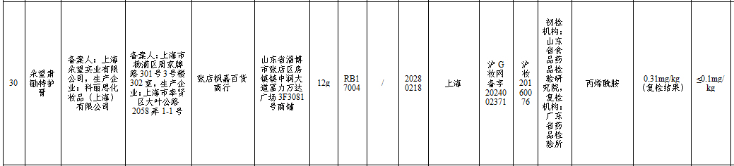 部分不合格产品中还检出了化妆品明确禁用的致癌原料“丙烯酰胺”和抗生素“他克莫司”。