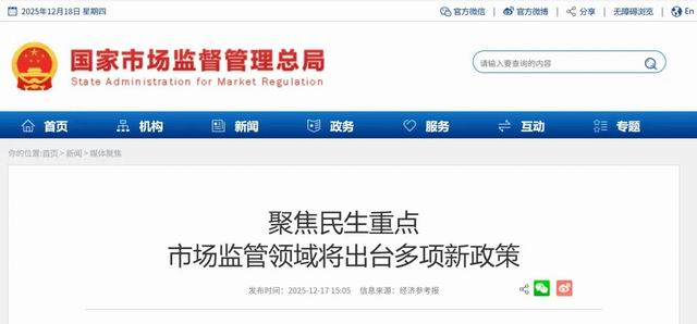 网络整理 2026-01-0512月16日,在市场监管总局四季度新闻发布会上,记者获悉,围绕规范平台经济、强化食品安全、加强反垄断反不正当竞争、加强和保障纤维制品质量安全监管等多个民生重点领域,市场监管总局将出台多项新的政策文件。