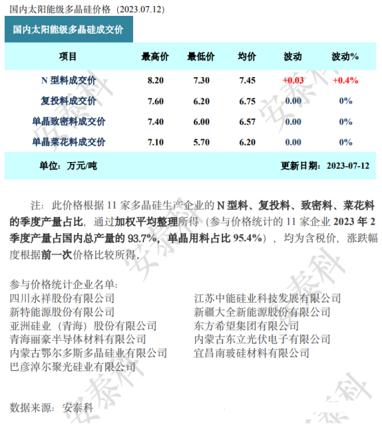 网络整理 2025-09-01证券之星光伏行业周报:中国有色金属工业协会硅业分会数据显示,本周多晶硅市场N/P价差扩大,整体持稳微涨。国金证券最新观点指出,硅料价格明确触底后,由下游快速增长的N型电池产能释放所驱动的上涨和分化,随下半年N型电池产能加速释放。宏观方面,国家发展改革委、国家能源局、国家乡村振兴局关于实施农村电网巩固提升工程的指导意见,文件指出,因地制宜通过合理配置分布式光伏和风电等建设改造可再生能源局域网。企业方面,晶澳科技发布公告称,公司本次向不特定对象发行可转换公司债券募集资金总额不超过896030.77万元,加码垂直一体化产能建设。亿晶光电发布业绩预增公告,预计2023年半年度实现营业收入约44亿元,较上年同期增加约27%;归母净利润2.80亿元到3.20亿元,同比增加1086%到1255%。