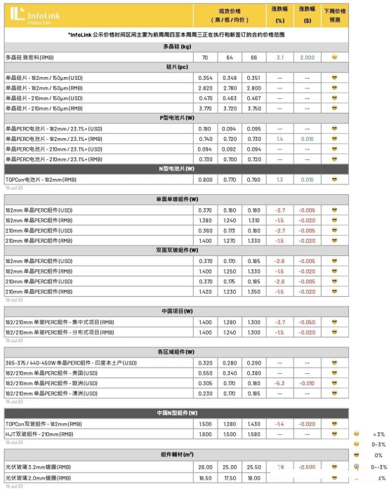 本周组件价格仍持续出现下探,然跌价幅度已相对前期收窄,一线厂家新签订单价格PERC 单玻组件约落在每瓦 1.3-1.35元人民币,多数价格持稳为主,然而部分企业迎接半年报、以及下半年市占率的竞争,价格仍有下探至1.28-1.3元人民币的水平,而二三线报价也持续下探,本周虽整体落在1.25-1.28元的水平,然而部分已开始有低于1.25元的价格。高价部分,仍有前期订单在执行,价格基本落在1.4左右的区间。