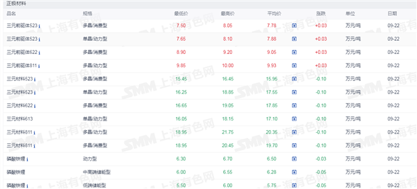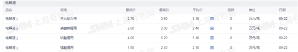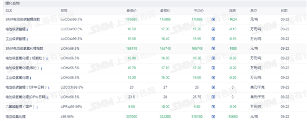 网络整理 2025-09-01证券之星新能源车行业周报:据上海有色网,截止9月22日,电池级碳酸锂16.5-17.9万元/吨,环比上一工作日下跌1500元/吨;工业级碳酸锂15.5-16.4万元/吨,环比上一工作日下滑1500元/吨。近期随着碳酸锂价格的持续下探,部分锂盐企业制造成本已被击穿,逐步调低开工,产量走低,部分厂家挺价心态渐强,跌幅有所收窄。