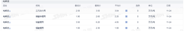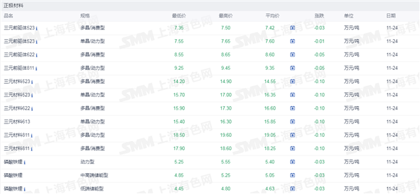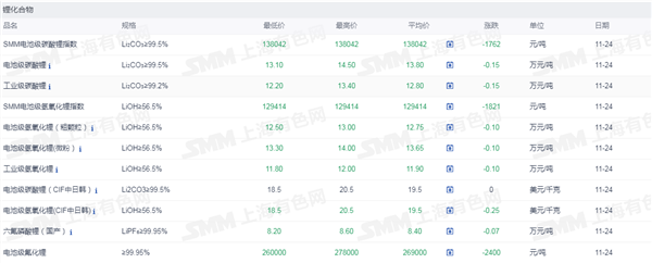 网络整理 2025-09-01证券之星新能源车行业周报:据上海有色网,截止11月24日,电池级碳酸锂13.1-14.5万元/吨,均价13.8万元/吨,环比上一工作日下滑0.15万元/吨;工业级碳酸锂12.2-13.4万元/吨,均价12.8万元/吨,环比上一工作日下滑0.15万元/吨。今日锂盐企业延续挺价出售散单的态度,依然以长单出货为主;而在近期碳酸锂现货价格连续下跌后,下游少部分正极材料企业采买情绪略微转变,个别正极材料企业在现货价格低位时期进行少量采买,但整体现货市场的散单成交量级仍较平淡,并未出现明显放量情况。